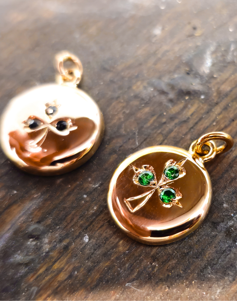 Dieser Anhänger aus 585er Rosègold wurde aus Altgold des Kunden neu geschmiedet und einem ihrer Erbstücke (links) nachempfunden, beim neuen Anhänger sollten es dann aber leuchtend grüne Smaragde sein, statt schwarzen Diamanten.