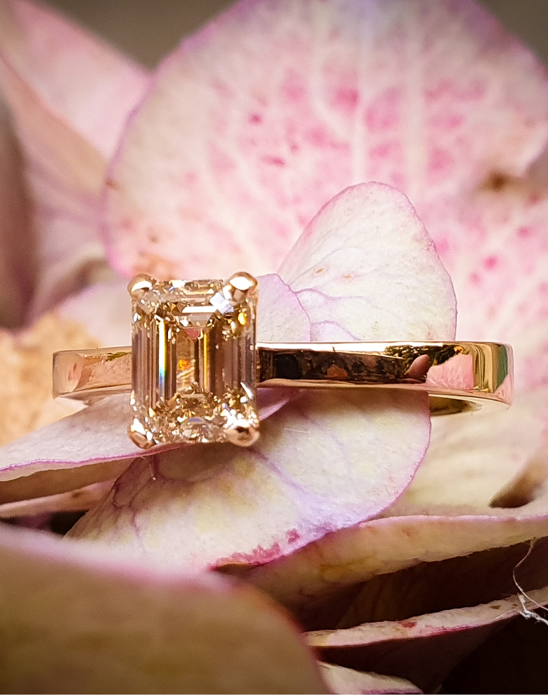 Verlobungsring aus 750er Rosègold mit einem Champagnerfarbenen Diamanten, 1 Carat, im Baguetteschliff