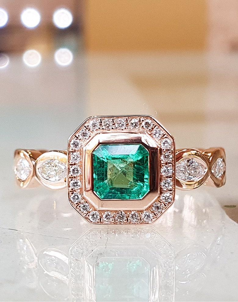 Edler Smaragdring aus 750er Rosègold, umrahmt mit selbst mitgebrachten Diamanten der Kundin