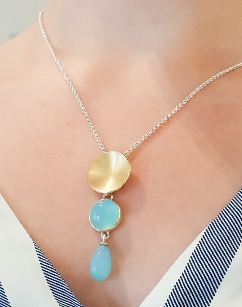 Großer Anhänger aus 750er Gold, 925er Sterlingsilber und Chalcedonen