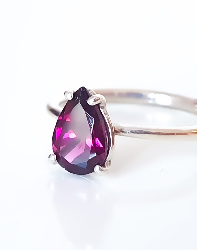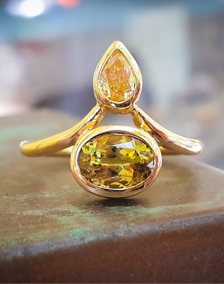 Ring mit ovalen Maligranat und gelbem Diamanttropfen, aus 750er Gold