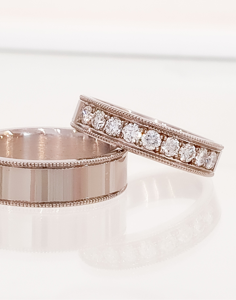 Partnerringe aus 585er Weißgold, mit Brillanten und Milgrainmuster