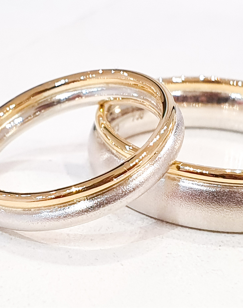 Trauringe aus 925er Sterlingsilber und 750er Gold mit glänzender und mattierter Oberfläche