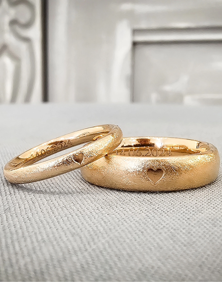 Trauringe aus 750er Rosègold mit Herzgravur und Eismatter Oberfläche